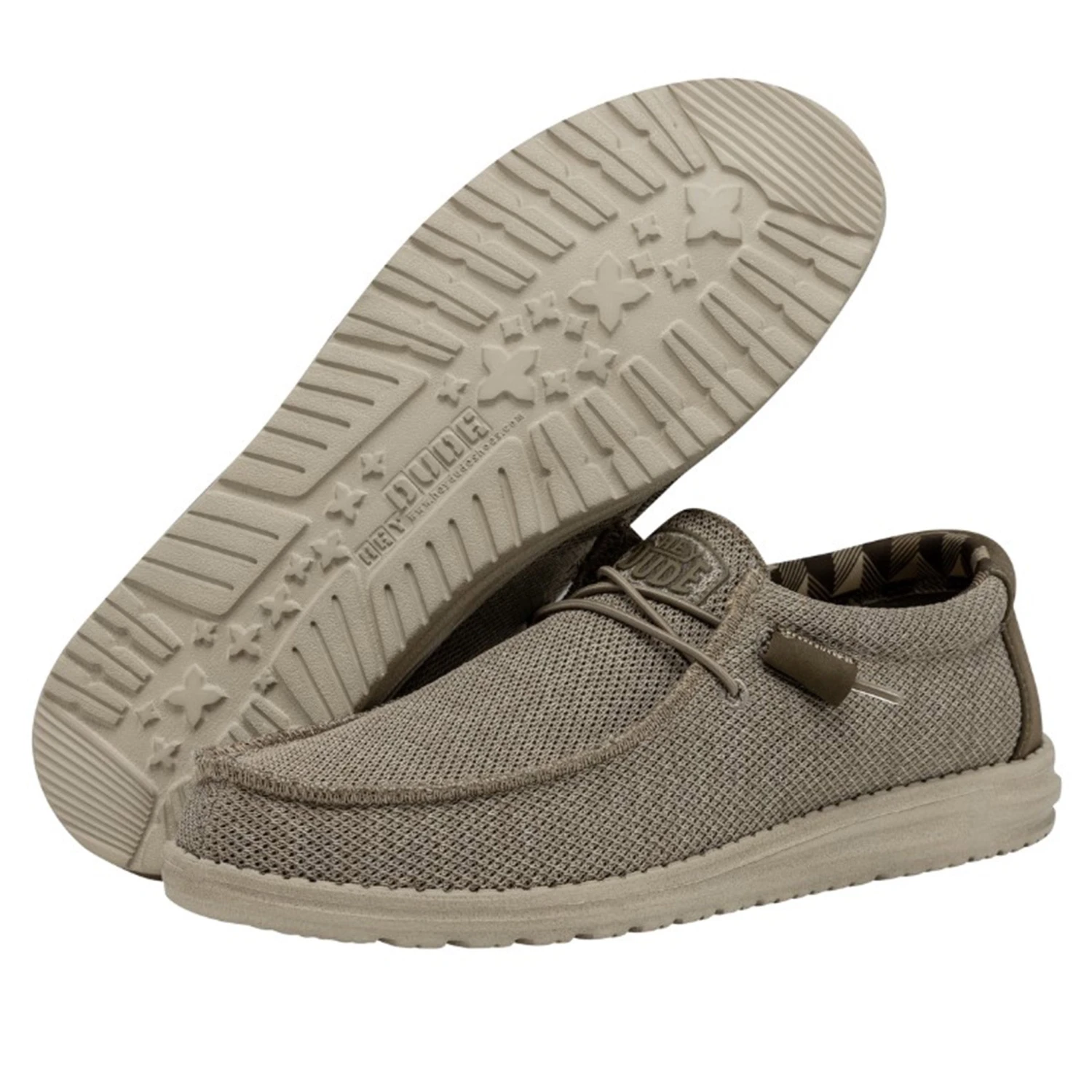 These men’s shoes from Hey Dude are a beige color with a cream sole! Hey Dude shoes are comfortable and very light weight! If you wear a half size, we suggest choosing the next up.