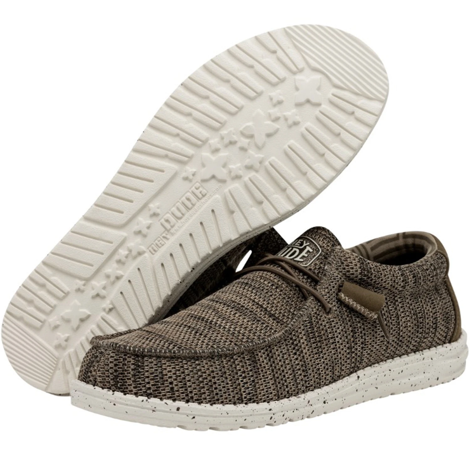 These Hey dudes for men give them a laid back and easy going look. They are brown in color with a patch of solid color on the back side of them. They can wear these for dressing up or down.Â