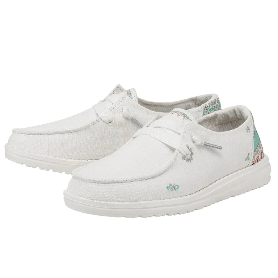 The Wendy Flora Lily White Heydude is a classic low-top moc in breathable chambray cotton. Easy-On elastic lacing system and our patented UltraLIGHT EVA outsole for total comfort. With stitched flowers inspired by antique Florentine embroidery. Just right for padding across a summer lawn.Â