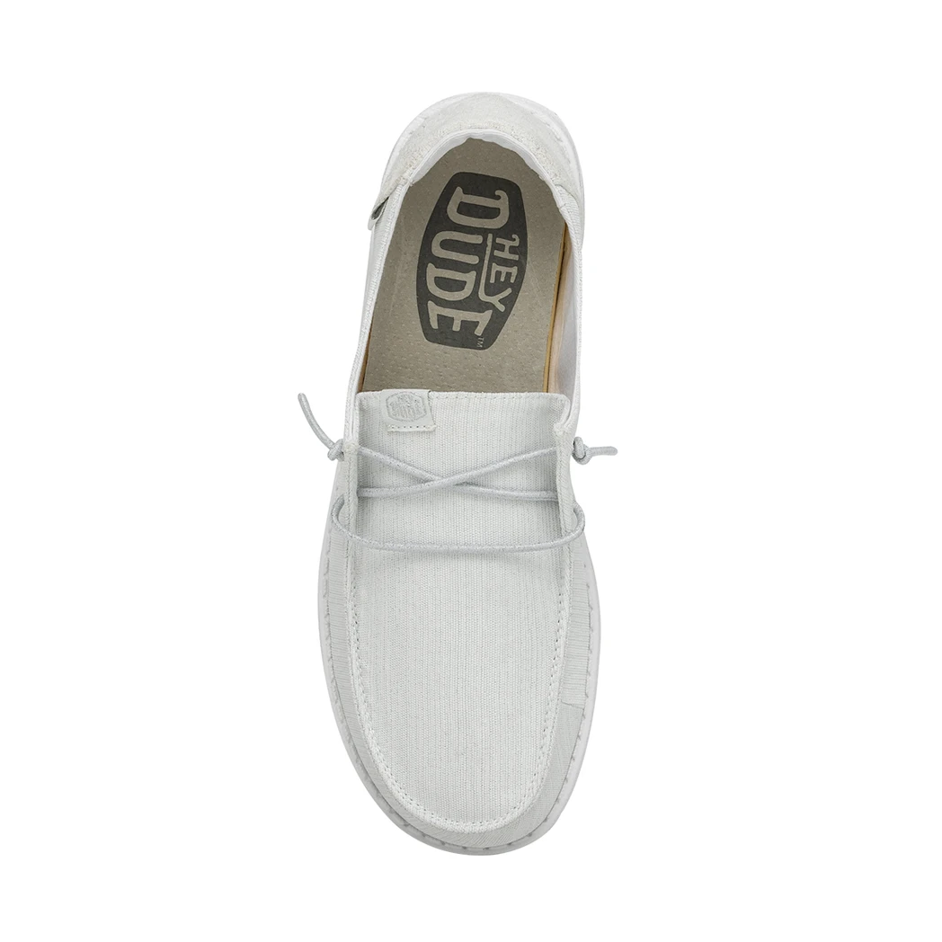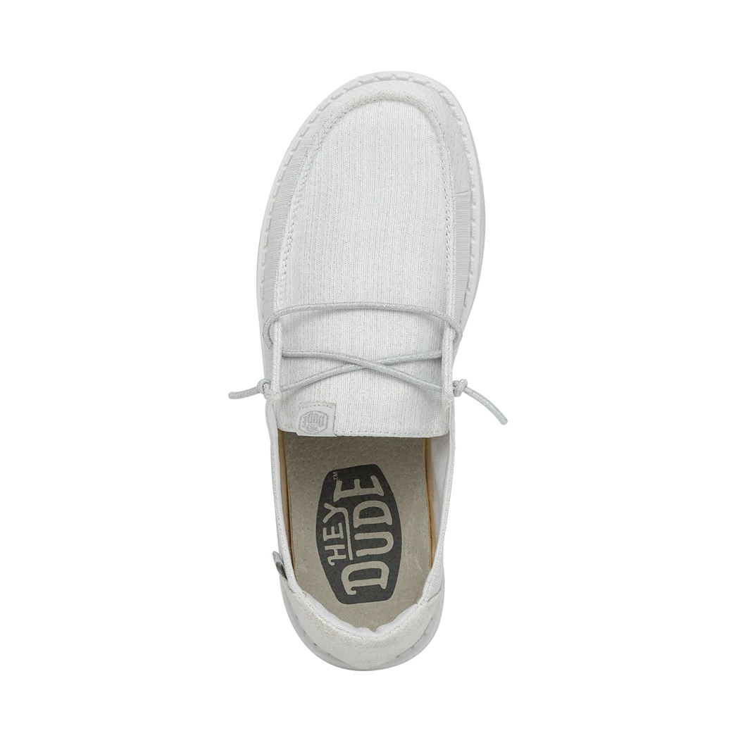 The Hey Dude Wendy Glitter Cloud Dust was made to shine. Perfect for Spring and Summer, this shoe is made of a durable, metallic textile upper in front and features a fun glittery heel. Lined with a light cotton-blend lining, easy-on, elastic lacing, ultra lightweight outsole, this shoe is stylish and comfy!Â